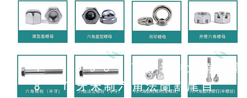 螺栓螺釘系列 外六角螺栓、內六角螺栓、雙頭螺栓、單頭螺栓、牙棒、牙條、U形螺栓、T形螺栓、六角法蘭螺栓、六角帶介螺栓、半圓頭方頸螺栓、沉頭方頸螺栓、馬車螺栓、圓頭帶榫螺栓、圓頭螺栓、扭剪型螺栓、方頭螺栓、活結