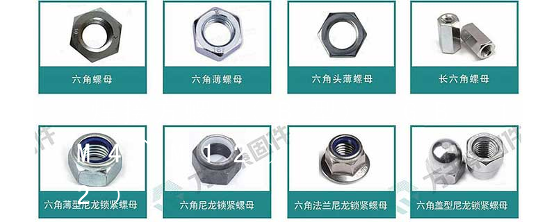 標準方螺母C級GB 39—88;六角螺母C級GB/T41—2000;六角厚螺母GB 56—88;蝶形螺母GB 62—88;環形螺母GB 63—88;組合式蓋形螺母GB 802—88;球面六角螺母GB 804—88;扣緊螺母GB 805—88;滾花高螺母GB 806—8